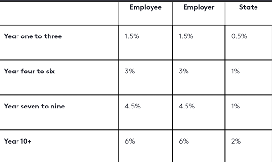 - Equal contributions: employers and employees contribute the same percentage, with an additional State top-up.